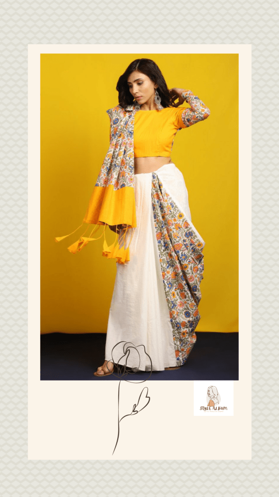 Give a new look to your cotton saree by pairing it with denim jacket. Nowadays, it’s an trend to style a saree with various shade denim jacket. Pair, up your cotton saree with your preference denim jacket and be a trendsetter of the season.