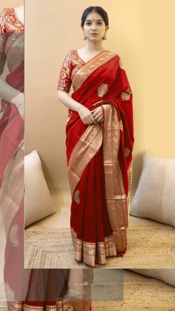 If keeping it low key and simple is your style, this beautiful woven red silk saree with mustard yellow border and scattered buttis is ideal to wear for a wedding sessions.