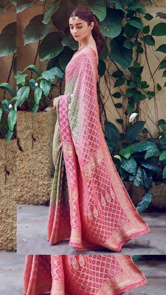 To Keep up together along with her conventional looks Alia Bhatt served us with her admirable beauty in a green and ombre shade Bandhani saree, custom made for her through Tarun Tahiliani withinside the shades of green and red.