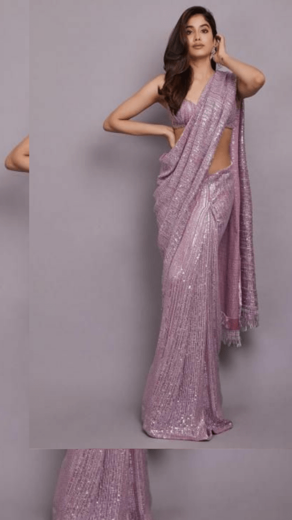 We will take a moment to realize Janhvi’s desire of colour, here Lavender being an offbeat colour which is a romantic and trendy usual wear, Janhvi become a breath of sparkling air in her sequin saree.