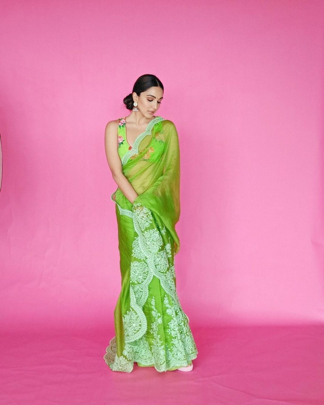 The organza saree is intricately embroidered in self-coloured thread along its scalloped hemline and pleats. It is paired with a matching green sleeveless blouse that is decorated with floral motifs and is A low tied bun with detailed makeup, bindi and bordered with a red coloured lining.